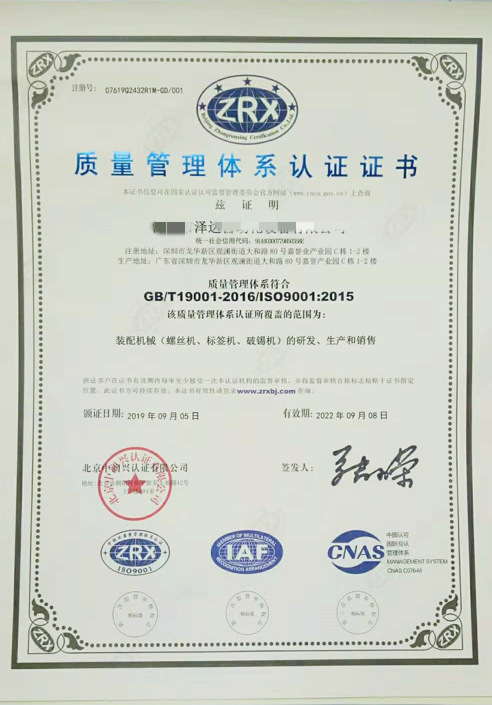 螺絲機專業生產廠家已通過ISO9001質量管理體系認證